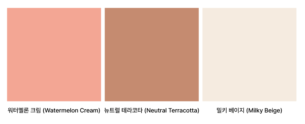 - 뷰티/웰니스: 기존의 뻔한 핑크가 아니라, 피부톤과 닮은 ‘워터멜론 크림’이나 ‘뉴트럴 테라코타’ 계열이 대세다. 건강하고 자연스러운 아름다움을 강조한다.