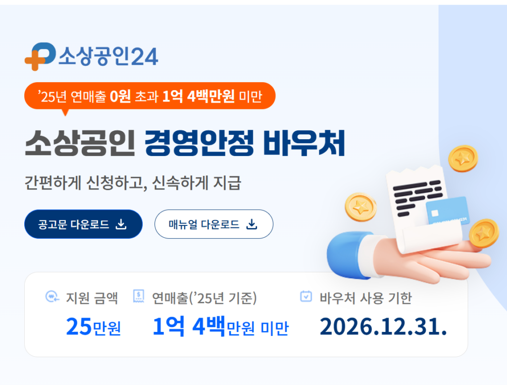 • 대상: 2025년 12월 31일 이전 개업하여 현재 영업 중인 소상공인